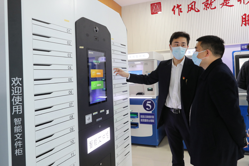 上海市閔行區(qū)七寶鎮(zhèn)社區(qū)事務(wù)受理服務(wù)中心的工作人員(左)向前來(lái)辦事的居民介紹智能文件柜的使用方法(2021年3月3日攝)。新華社記者 方喆 攝
