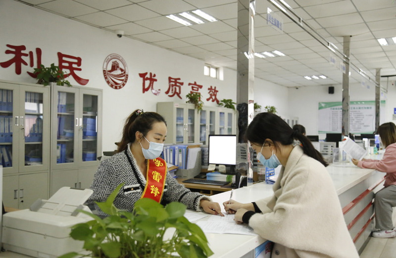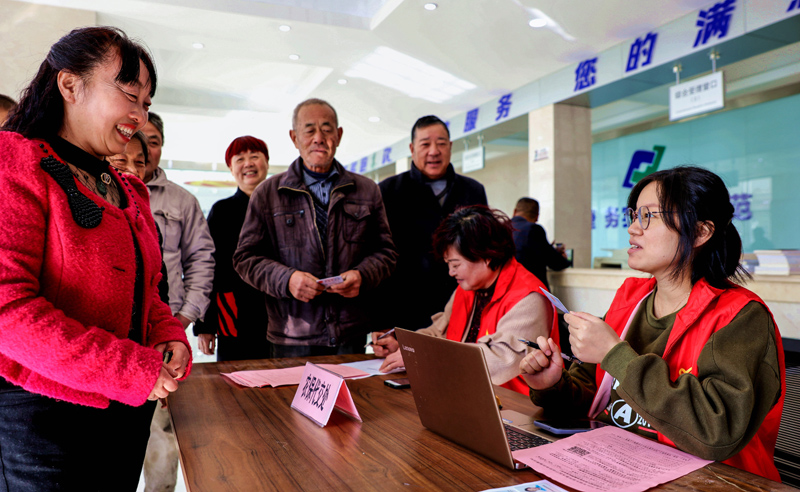 河北省邢臺(tái)市襄都區(qū)宴家屯鎮(zhèn)綜合服務(wù)中心工作人員協(xié)助辦事群眾填寫(xiě)相關(guān)表格(2022年3月30日攝)。新華社發(fā)(張馳 攝)