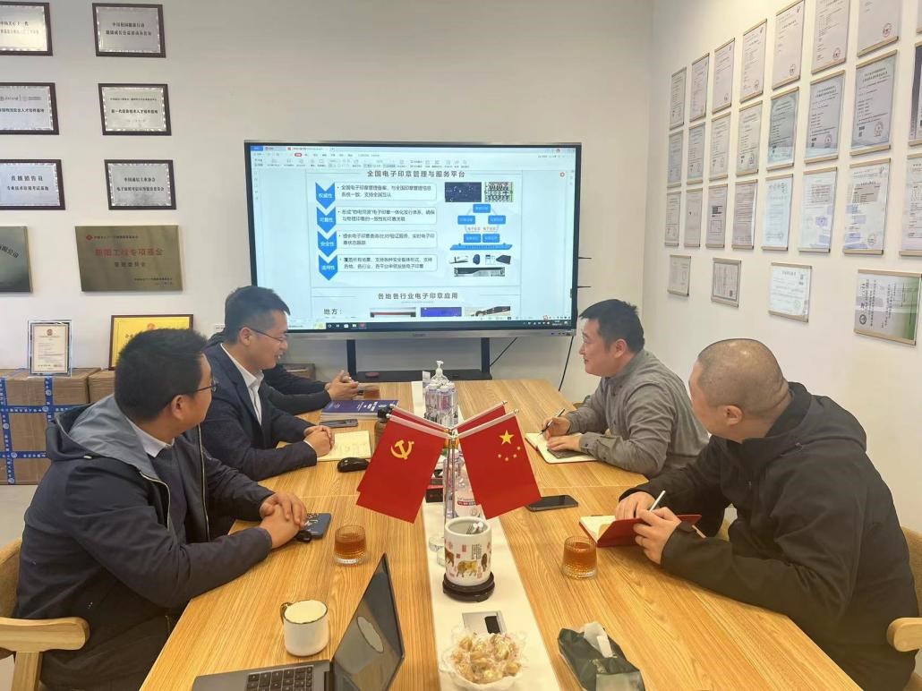 11月3日,中國標準科技集團有限公司副總經理劉東華、標新科技司法鑒定所所長張寅拜訪中國通信工業協會,就全國電子印章管理與服務平臺相關合作與協會副秘書長陳永祥等人進行深入溝通。