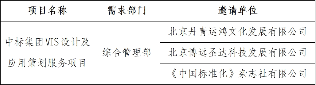 根據《中國標準科技集團有限公司采購工作管理辦法(試行)》的要求,現對中標集團VIS設計及應用策劃服務競爭性談判邀請單位進行公示。