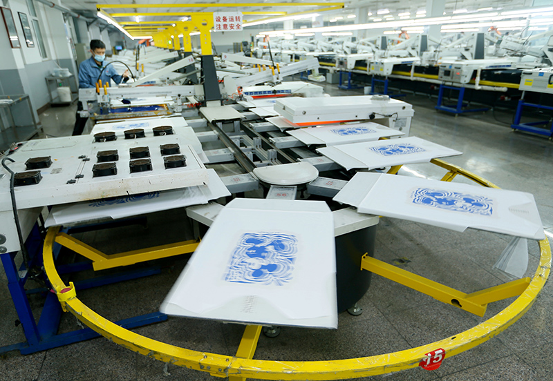 11月29日,山東青島華信印花有限公司的技術工人在生產出口到海外市場的服裝產品。