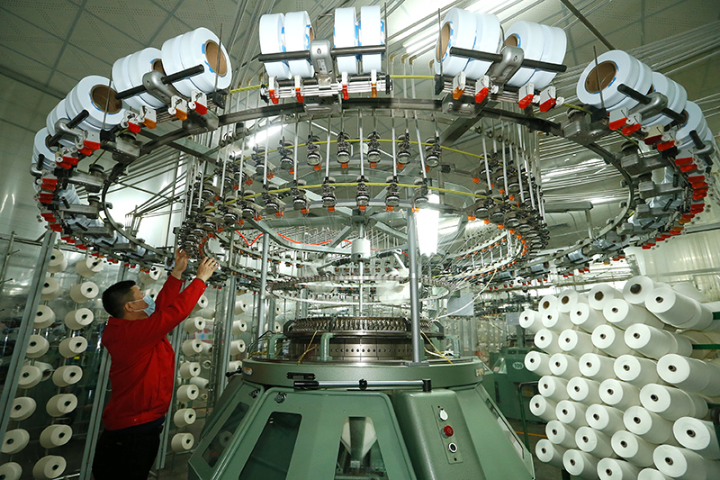 11月29日,山東青島頤和針織有限公司的紡織工人在生產出口到海外市場的服裝面料。