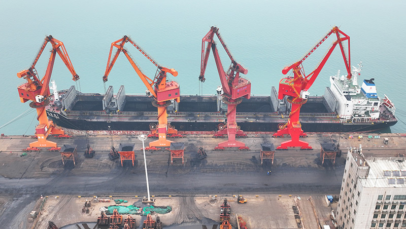 11月28日,在江蘇連云港港煤炭碼頭,貨輪在卸載到港的電煤(無(wú)人機(jī)照片)。