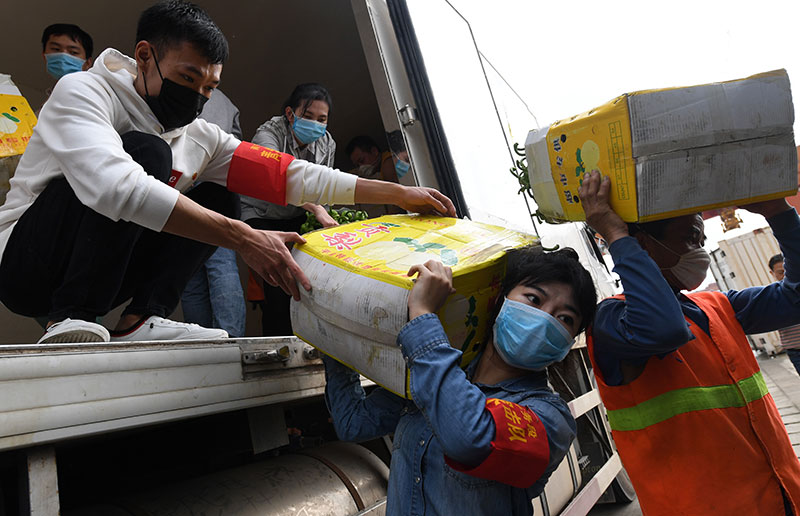 2020年3月3日,在廣西南寧國際鐵路港,南寧車務段“青年突擊隊”隊員黃瑩瑩(右二)在搬運廣西馳援湖北物資。新華社記者 陸波岸 攝
